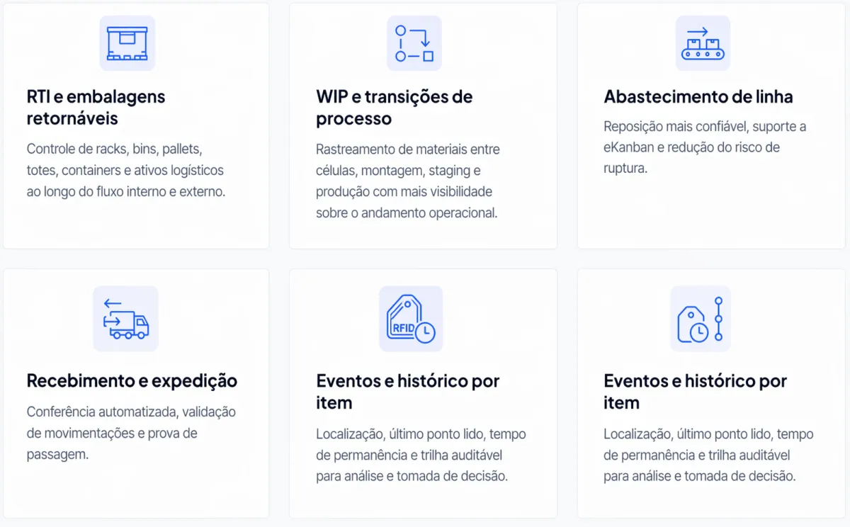 Não. A solução pode apoiar RTI, WIP, abastecimento de linha, docas, expedição, recebimento e rastreabilidade de materiais.