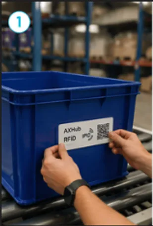 Peças, embalagens, bins, racks e WIP recebem tags RFID adequadas ao ambiente.